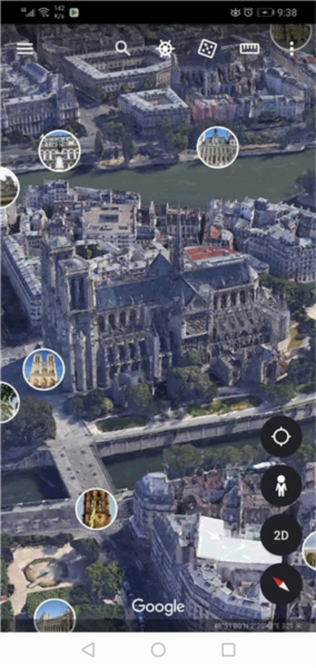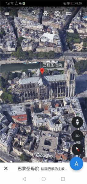 3、举个例子,我们在搜索框里敲个“巴黎圣母院”,画面立马就飞过去了,让你从空中俯瞰它的全貌。
