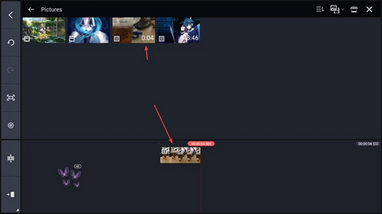 4、选好视频之后,你看,它就自动躺在下面那条长长的时间轴上了。点一下这个视频条,就进入编辑状态了。