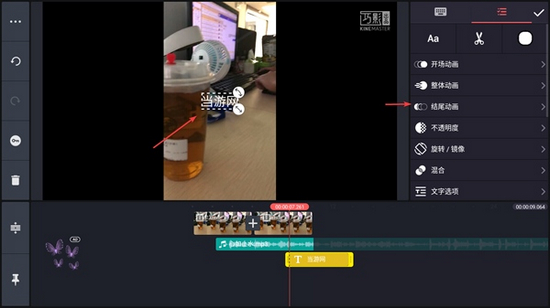 4、输完字之后,字幕就直接显示在视频画面上了。你可以直接用手拖动它,摆在任何你觉得合适的位置。同时右边也有一堆工具,可以给字幕改颜色、换字体,还能加各种酷炫的动画效果。