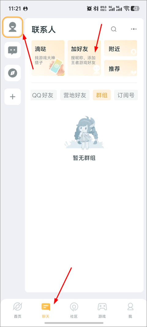 1、打开王者营地,戳一下最下面那个“聊天”按钮,然后点左上角那个像通讯录的图标,就能看到“加好友”了。