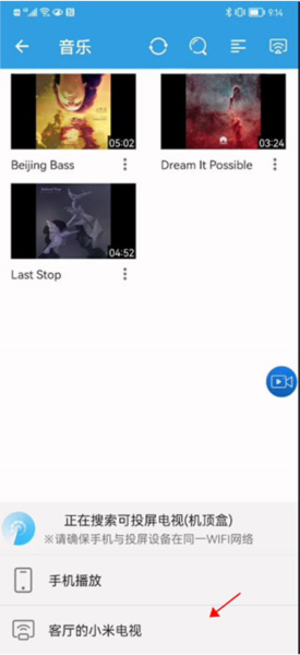 3、选好歌曲后,点击界面右上角的投屏图标,应用便会开始搜索在同一个网络下的电视或机顶盒设备。在搜索出的设备列表中,找到你的电视并点击它,即可发起连接。