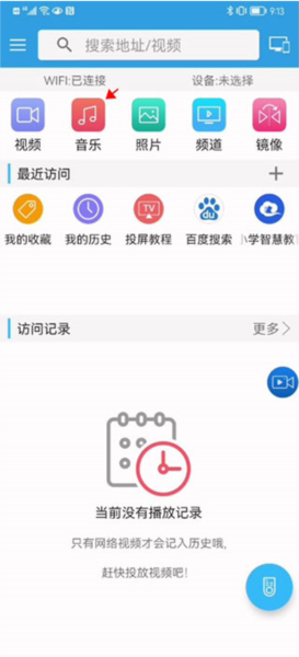 1、首先在手机上下载并打开TV投屏助手,进入应用主界面后,可以看到视频、照片、音乐等分类,这里我们以音乐为例,点击“音乐”。