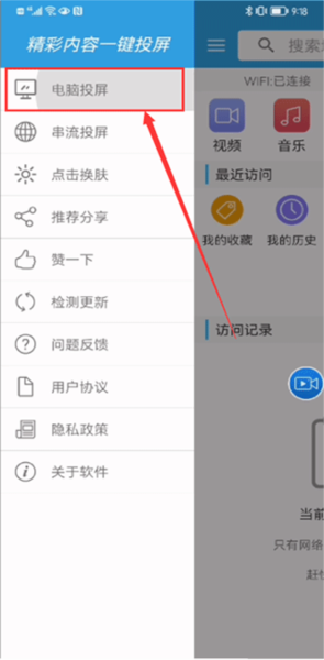 1、运行应用并进入主页,点击屏幕左上角的菜单按钮,然后在弹出的选项中选择“电脑投屏”这个功能。