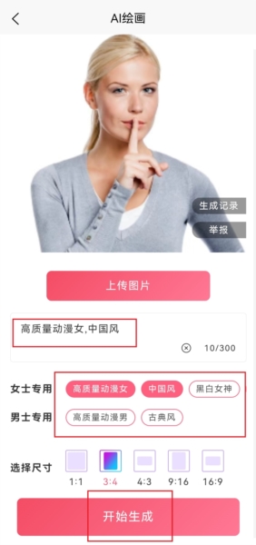 2、进去之后,第一步是上传你的图片。然后,你可以选择一个你喜欢的风格,或者在输入框里自己描述想要的风格,再选一下需要的图片尺寸就行了。