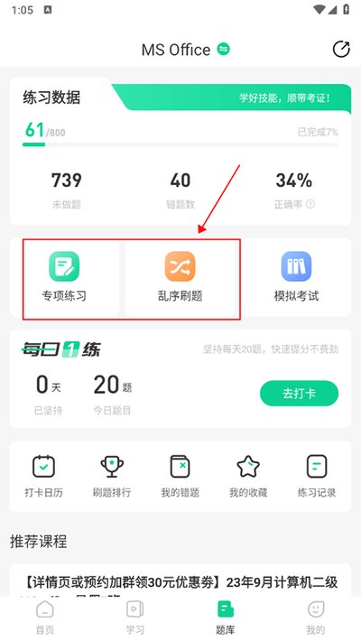 1、打开app后,在首页就能看到题库入口,你可以根据自己的复习进度选“专项练习”,或者直接“乱序刷题”来个摸底考。
