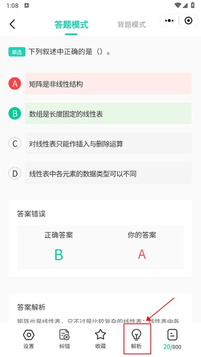 4、要是在答题模式下做错了,也别慌。错了的题旁边会有个“解析”按钮,点一下就能看到详细的分析,帮你把知识点巩固牢了。