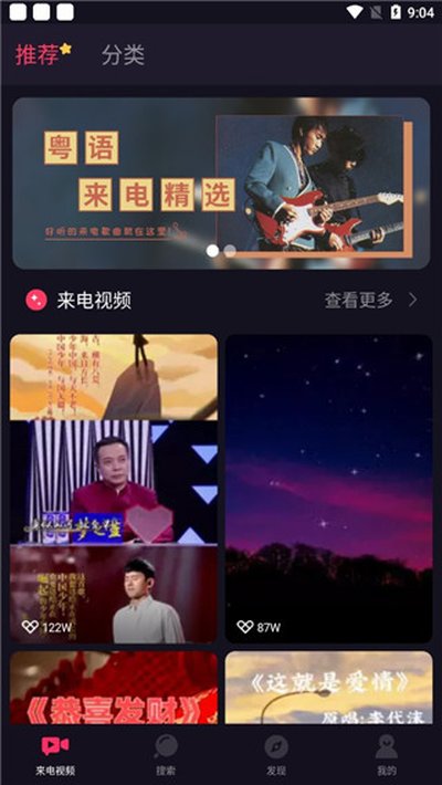 2、进来之后,主界面就是“来电视频”,大家看下面这张截图,主要就俩板块:“推荐”和“分类”。推荐页里头的,基本都是最近网上比较火的那些视频。