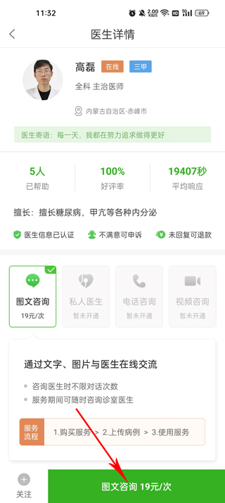 5、跳转到该医生的个人主页后,选择“图文咨询”功能,就可以开始进行更深入的追问了。