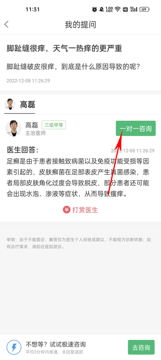 4、进入问题详情页后,在给你答复的医生信息栏右上角,找到并点击“一对一咨询”按钮。