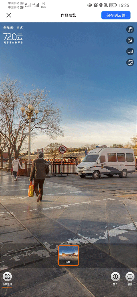 想给你的全景作品加点背景音乐?用720云手机版超简单!打开App,一眼就能看到底部菜单栏中间那个醒目的蓝色加号,所有创作都从它开始。点进去后,你可以选择现场开拍,或者更方便地从手机相册里导入你已经拍好的全景图。图片上传后,在下方的工具栏里找到“音乐”图标,轻松一点就能为你酷炫的作品配上动感旋律啦!
