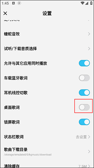 3、在设置菜单里,向下滑动页面,找到“桌面歌词”这一项,然后点击它右边的开关按钮来启用。