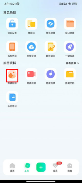 2、进了工具页面,第一个就是【隐藏相册】,直接点进去就行。当然了,你要是想藏视频或者文件,操作流程也大同小异。