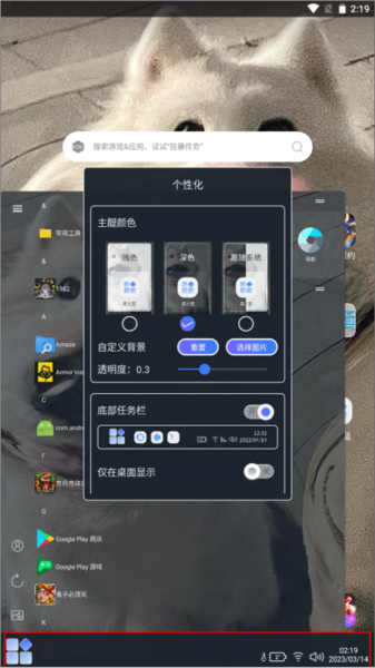 2、进了个性化页面,一眼就能瞅见“底部任务栏”的开关,把它打开就行。