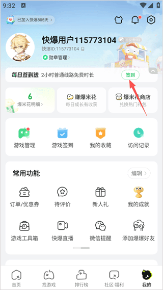 2、进入个人页面后,点击屏幕上方的“签到”选项,通过每日签到就能领取到两个小时的云游戏时间。