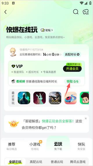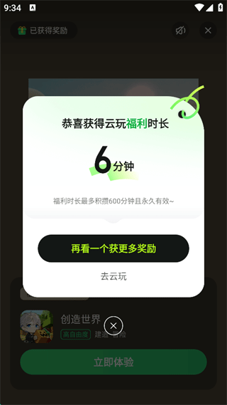 4、在云玩界面,你会看到“看视频”的选项,点击它右边的“领取”按钮,就可以通过观看视频来换取更多的云游戏时长。