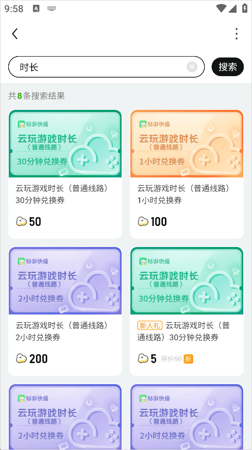 8、搜索结果会显示可兑换的云玩时长商品,你可以使用平时积攒的“爆米花”来进行兑换,这也是一个补充时长的好办法。