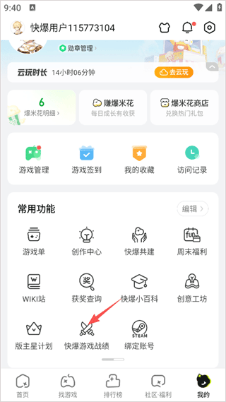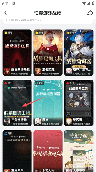3、滑动后,你就能看到更多功能选项,从中找到并点击“快爆游戏战绩”。