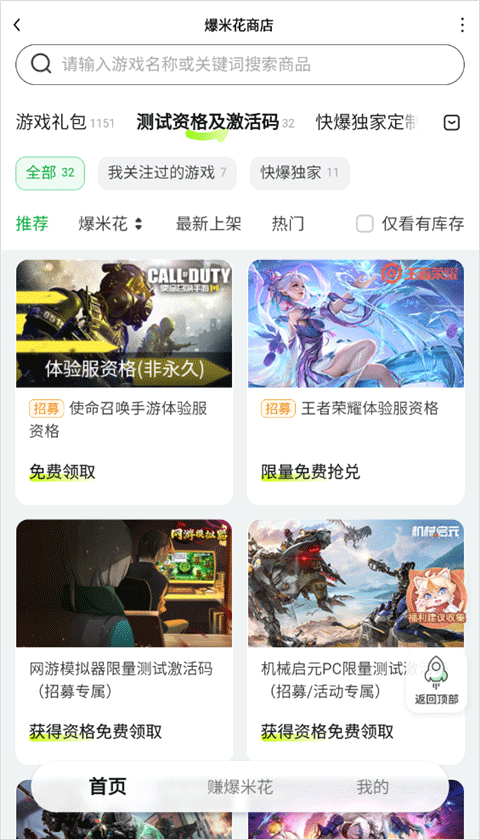 1、各位玩家可以先去【我的】-【爆米花商店】里逛一逛,有时候可以用积攒的爆米花直接换取到部分热门内测游戏的激活码。