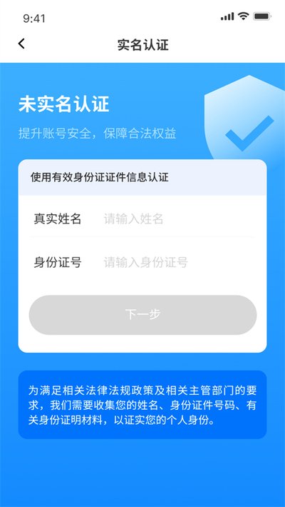 5、根据提示,准确输入你的真实姓名和身份证号码,然后点击“下一步”。