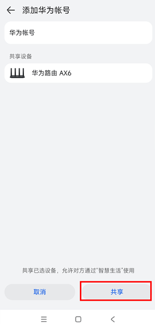4、在这里输入你想共享给的那个人的华为帐号,然后点“确定”,再点“共享”。
