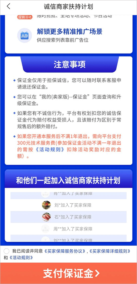那要是没干满一年,中途有事不干了,钱还能退吗?也能。你随时都可以联系客服申请退还。但是,这里有个坑要注意了:你开通买家保障服务没满一年的话,平台会从你的保证金里扣掉300块钱,名义是“技术服务费”。这个费用是优先从你那2000块里扣的。