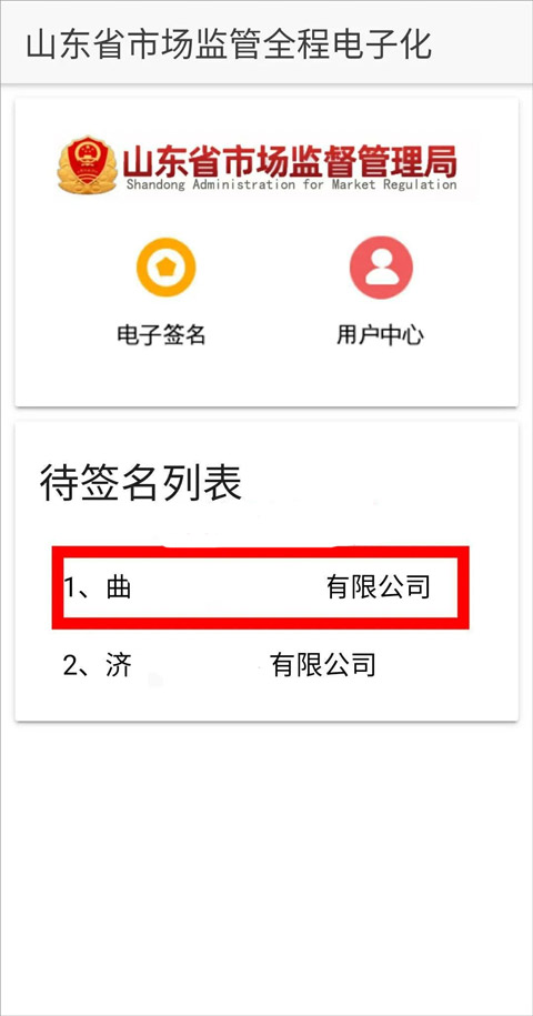 2、成功登进去之后,主页上就能看到等着你签名的公司了,在待签名列表里,找到对应的公司名字点一下。
