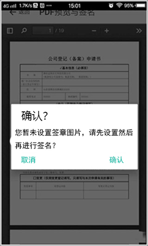 4、要是你之前没弄过签名的样式,系统会弹个窗提醒你,让你先设置再签名。看到截图里这个界面没,直接点“确认”,它就自己跳到签章图片设置那儿了,再点“确定”,然后选“设置手写签章”。