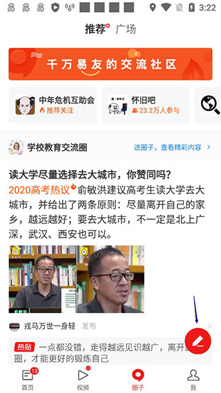 2、底部导航栏切换到“圈子”那一项,然后找到右下角那个小小的笔头图标,点它。