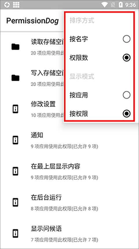 1、先装好权限狗,打开App后,点击右上角那个三条杠的图标,你可以选择按“应用排序”或者“权限排序”来查看。