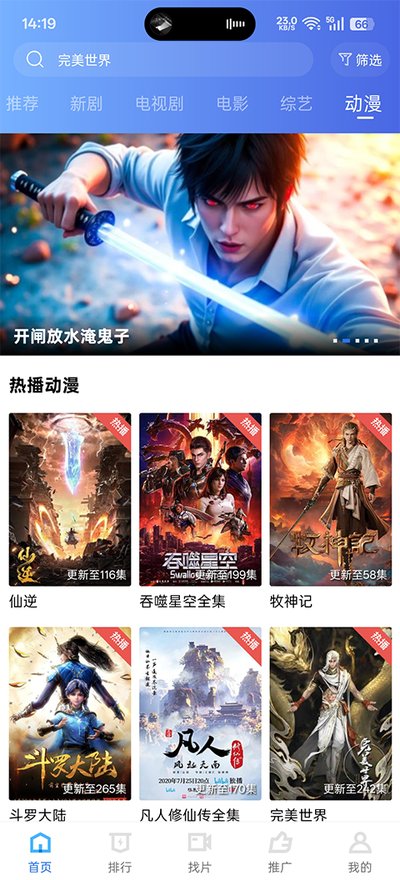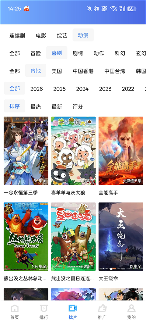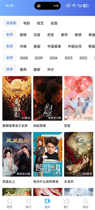 1、打开App之后,主页上就有个“找片”的按钮,点一下,就能按照“电视剧/电影/综艺/动漫”这些分类快速找到你想看的内容。
