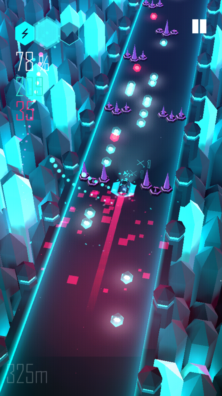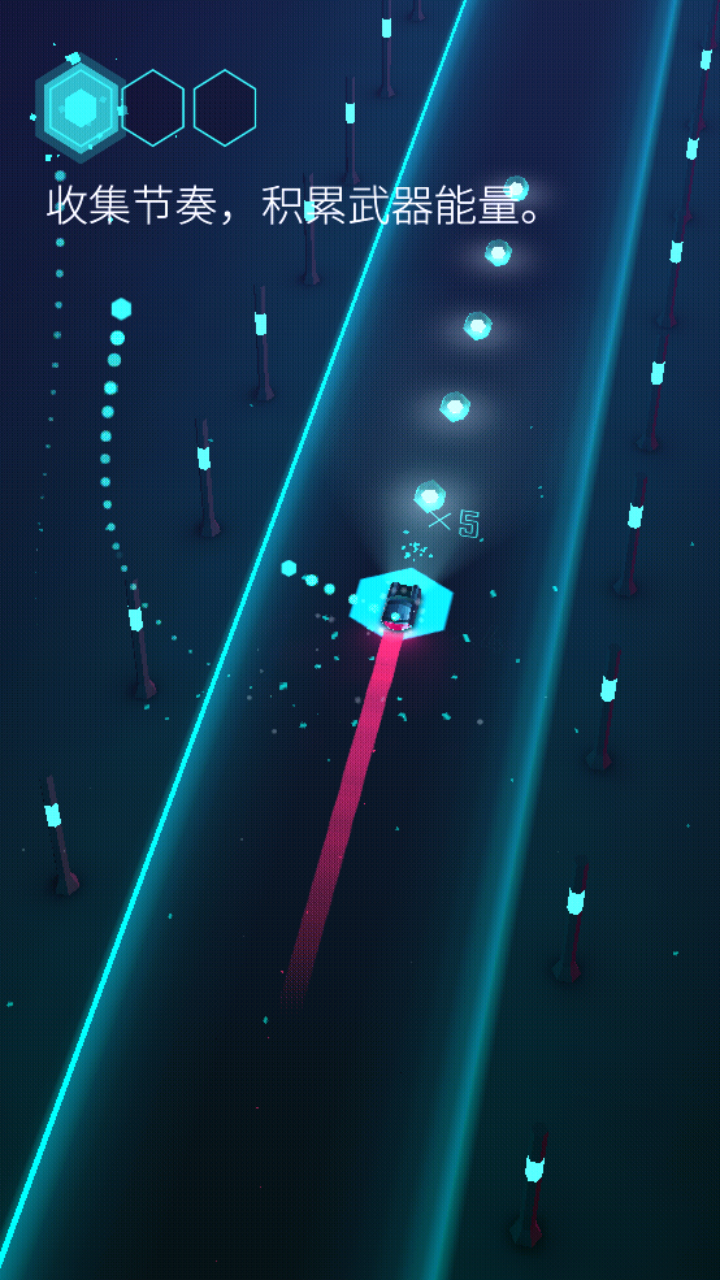 4、操作方式掰开来讲就几个动作:左滑左拐、右滑右拐、上滑跳(在空中也能转向)、下滑用能量格挡导弹。核心目标就是撑到进度100%。路上有尖刺,撞到会让你车速骤降,这时候后面的导弹就离你更近了。