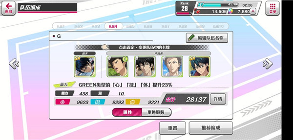 2.然后去“选手”界面,看看你每个队的队长技能是啥。记住,只有SR以上的卡才有队长技。技能分两种,一种是只加成同一种颜色,另一种是所有颜色都加成,用的时候看清楚了。