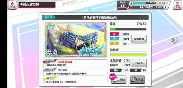 4.玩了一段时间,你会攒下一堆育成点和特训道具。想打高分就得靠这些东西升属性。点“卡牌”→“所持卡牌”→“特训板”,把角色的属性盘点亮。SR和SSR卡点到一定程度还能觉醒,换个新卡面。抽到重复的卡也别烦,特训板会自动给你延长,让你能点更多属性。