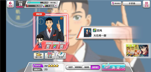 8.歌曲分好几种:通常、活动、期间限定。限定曲目每个月换,这个月快结束了,记得去把大石那首《恋风》打了。另外,你要是想挑战EX难度又没把握,可以组一队加血的卡,俗称奶妈队。因为这游戏打不过去会扣体力,还啥奖励都没有,血亏。