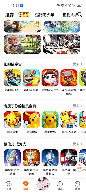 内容板块划分得非常清晰,包括推荐、热门游戏、活动专区、上头神作、火爆新游、主播热玩、预约有好礼、福利中心、热度飙升、每周推荐以及品质好游等多个栏目,目的就是为了让你能最快地找到自己感兴趣的内容。