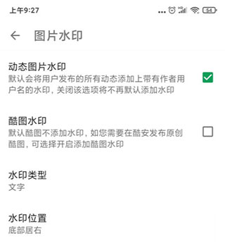 进去之后把“动态图片水印”那个开关给关掉就行。退回到发动态的界面,水印就没了,干干净净。