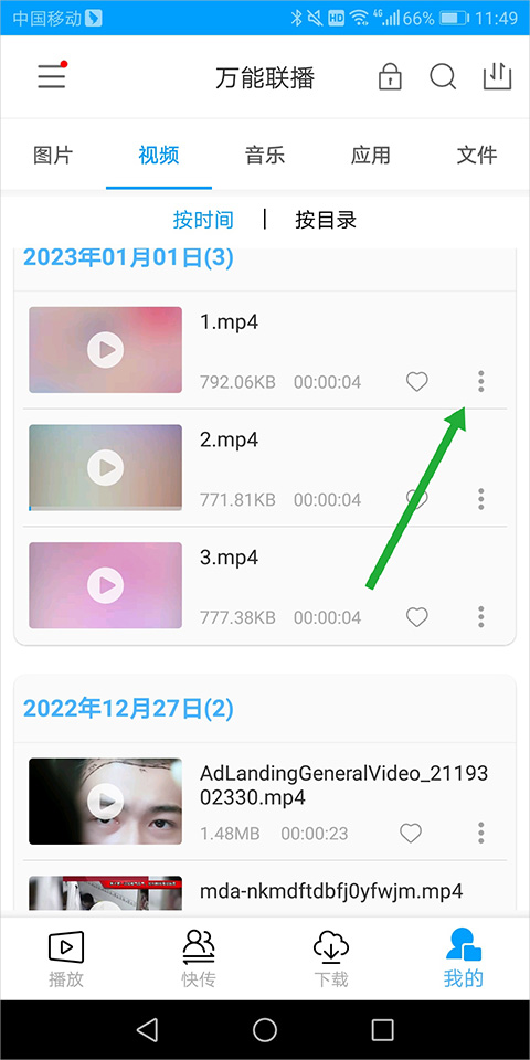 1、打开万能联播App后,先点进右下角的【我的】页面,找到你想要加密的那个视频,然后点它右边那三个小点点的图标。大家看下面这张截图,就是绿色箭头指的那个地方。