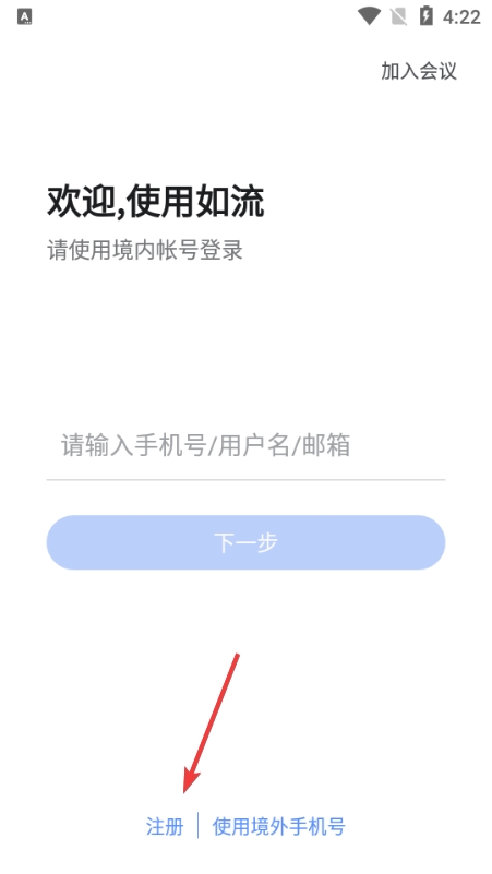 1、咱们先把如流App打开,在登录界面就能找到注册的入口。你看截图这里,国内和国外的手机号都能用。