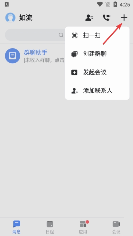1、回到App主界面,看到右上角那个“+”号没?点它,然后选“添加联系人”。