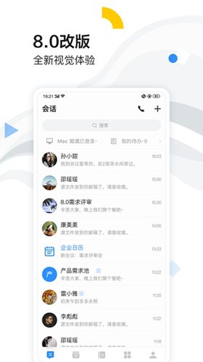 公司大了找人是个麻烦事,这个App里有个全局搜索,想找哪个同事,直接搜名字就行,搜到就能直接发起聊天,都不用先加好友,超级方便。