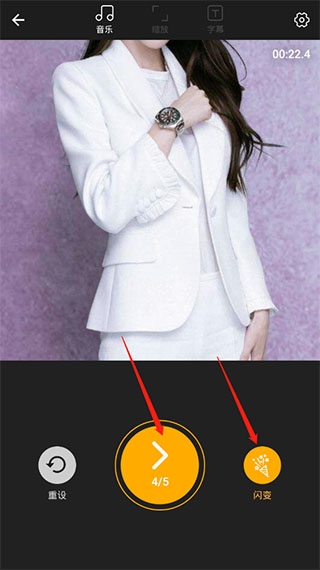 3、这时候就可以正式开工了。看到截图里那个“闪变”按钮没?点它能加转场特效。想换背景音乐的话,就点上面那个音乐符号。