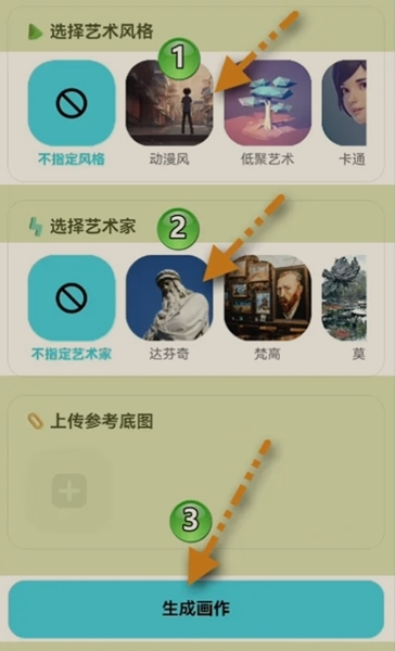 最后一步,选一个你喜欢的艺术风格,比如“二次元”或者“油画”,还可以选个艺术家风格,都定好之后,戳一下【生成画作】按钮就大功告成了。