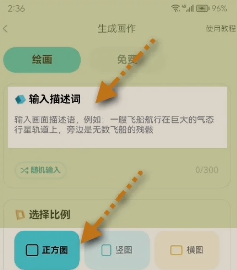在这里,你需要在上面的框里输入描述画面的文字,然后下面可以选择你想要的图片比例,比如手机壁纸尺寸或者方形的。