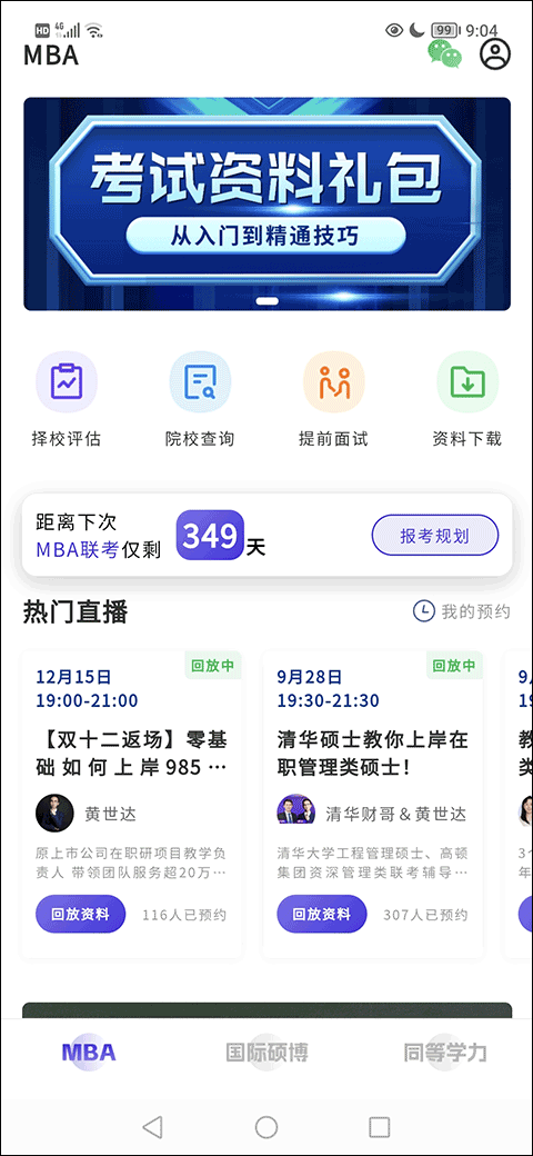 打开App主页,信息流还挺清晰的,“热门直播”、“课程中心”、“联考资讯”这几个板块能让你快速了解考试的动态和关键点。良心讲,它还有几个特别实用的查询小工具,像是“择校评估”、“院校查询”、“提前面试”和“资料下载”,这些都是备考初期最需要的信息,它都帮你整合好了。除了国内的,想了解国际硕博或者同等学力信息的同学,也能在里面找到对应内容。想提升自己、冲刺一把的同学,真的可以下载下来试试。