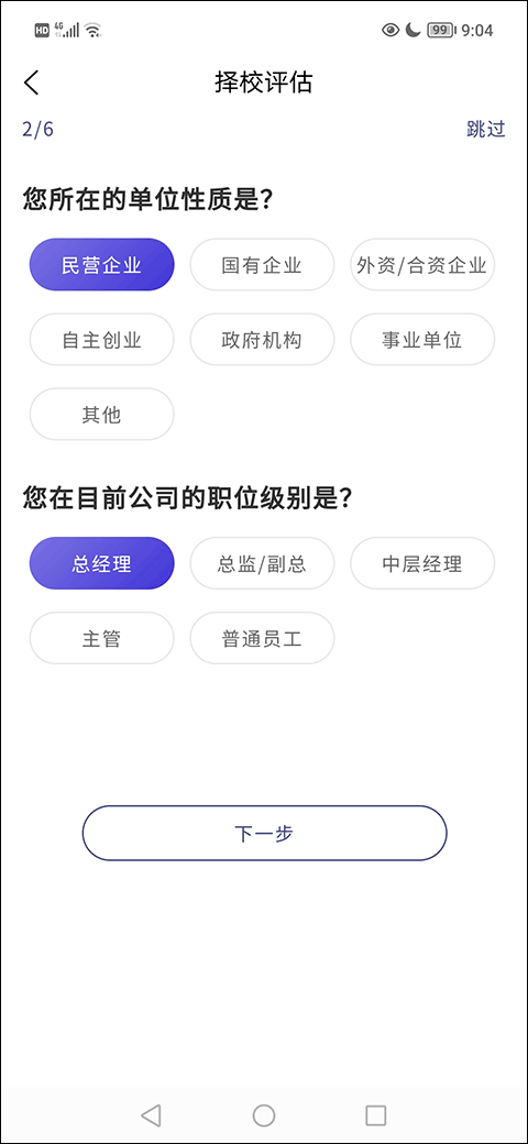 3、第二步是问工作情况,选一下你单位的性质,还有你现在的职位级别,然后继续点下一步。