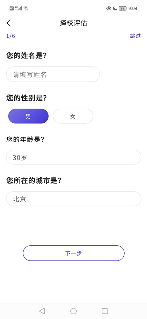 2、进来之后先填点基本信息,姓名、性别、年龄和所在城市,填完点下一步就行。