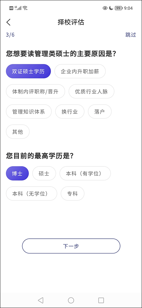 4、接着会问你学习的主要动机是啥,还有你目前的最高学历,选好之后继续找“下一步”点进去。