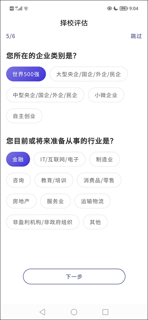 6、然后是关于你公司背景和未来规划的,选一下你所在的企业类别,还有你之后想从事的行业,继续点下一步。讲真,这个评估问卷还挺长的,得有点耐心,不过为了拿到靠谱的报告,值了。