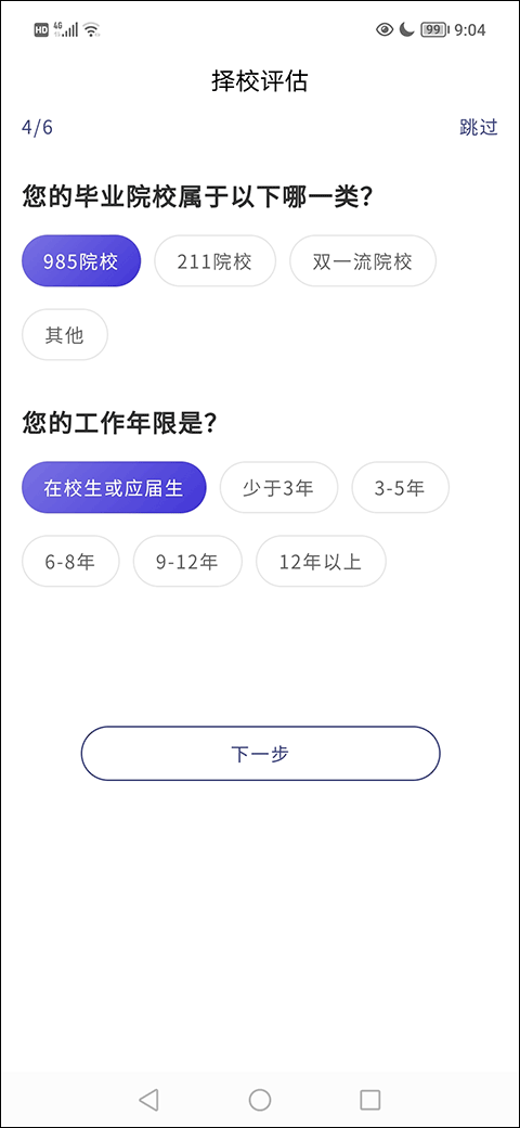 5、这一步要选你的毕业院校属于哪个类型,还有你的工作年限,操作很简单,选完点下一步。