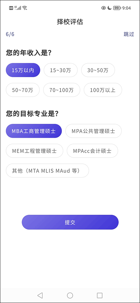7、第六步是填个人年收入情况和你的目标专业,选完之后点提交就差不多了。